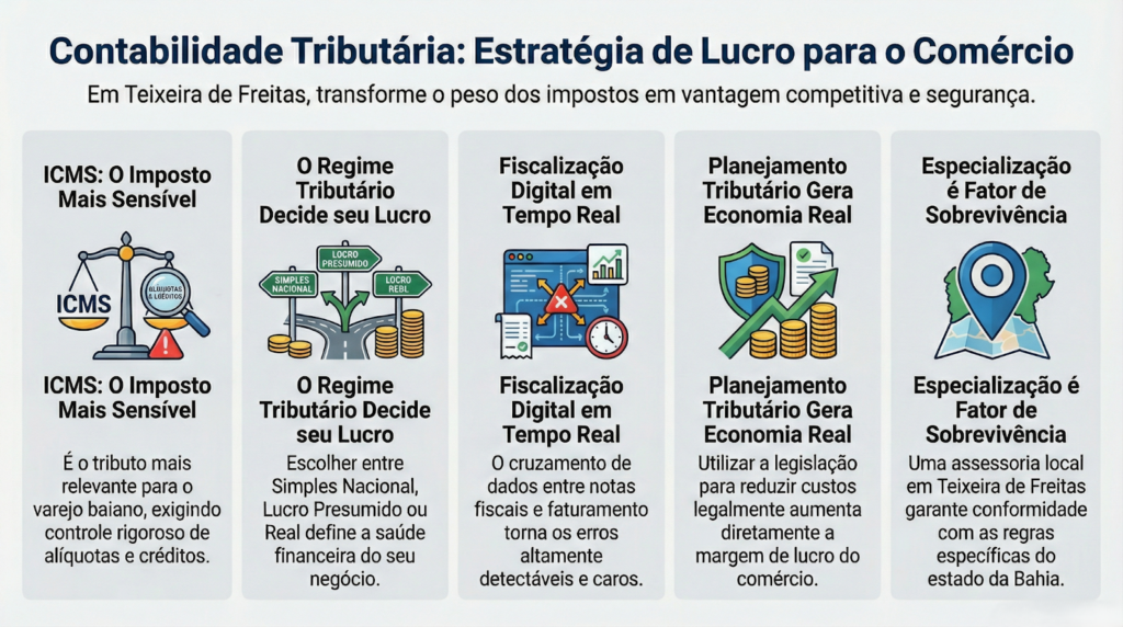 Essa análise reforça a importância de uma contabilidade para comércio em Teixeira de Freitas focada em planejamento, não apenas em obrigações mensais.